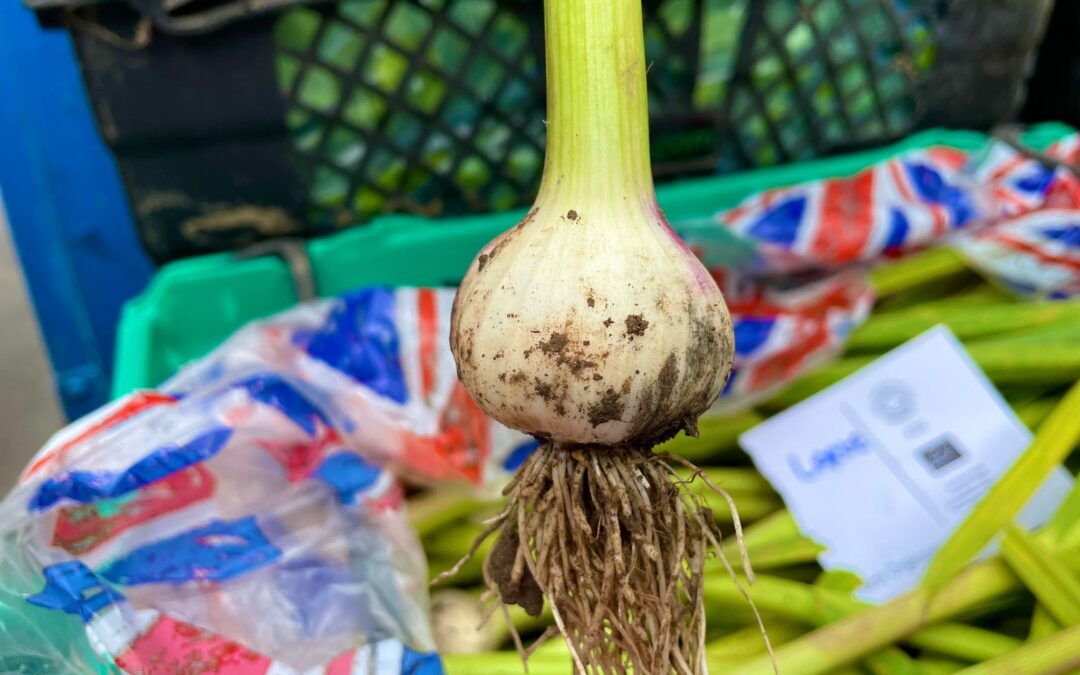 You’ll find a green garlic bulb from Ripple Farm in the bags this week. I love seeing the green garlic arrive. It’s the young garlic bulb, before the individual cloves have separated out, and before it has been dried. It has a milder flavour than mature garlic and you can eat the whole bulb and stem.